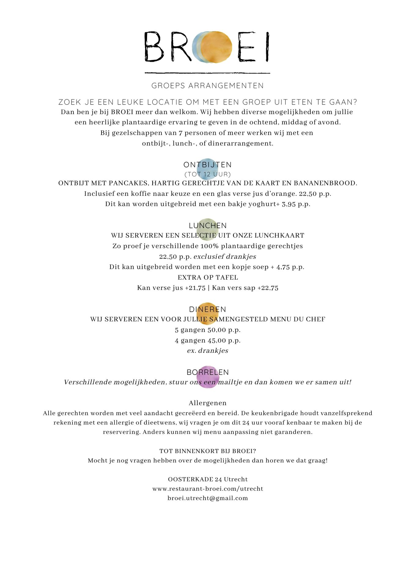 We zijn vanaf 09:00 uur open voor koffie en zoetigheid. Vanaf 10:00 kan je bestellen van onze dagkaart. Borrelen kan je bij BROEI de hele dag door. Flexwerkers zijn bij ons van harte welkom. Schuif aan aan één van de flexwerktafels en ontmoet gelijkgestemden.